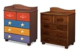 Our Star Rocket 5-drawer hardwood chest is well-built for kids, and its looks can be changed as your child grows. Made of solid hardwood with dark Chocolate finish, the drawer fronts are stained in primary colors and have a Chocolate finish on the back, and can be reversed if the child outgrows the colorful stains. Chest has quality telescopic drawer glides, and finished back. Includes set of Chocolate wave knobs and set of Planet and star knobs. Changing table tray and changing pad cover sold separately. 33?L, 24?D, 36.5?H .